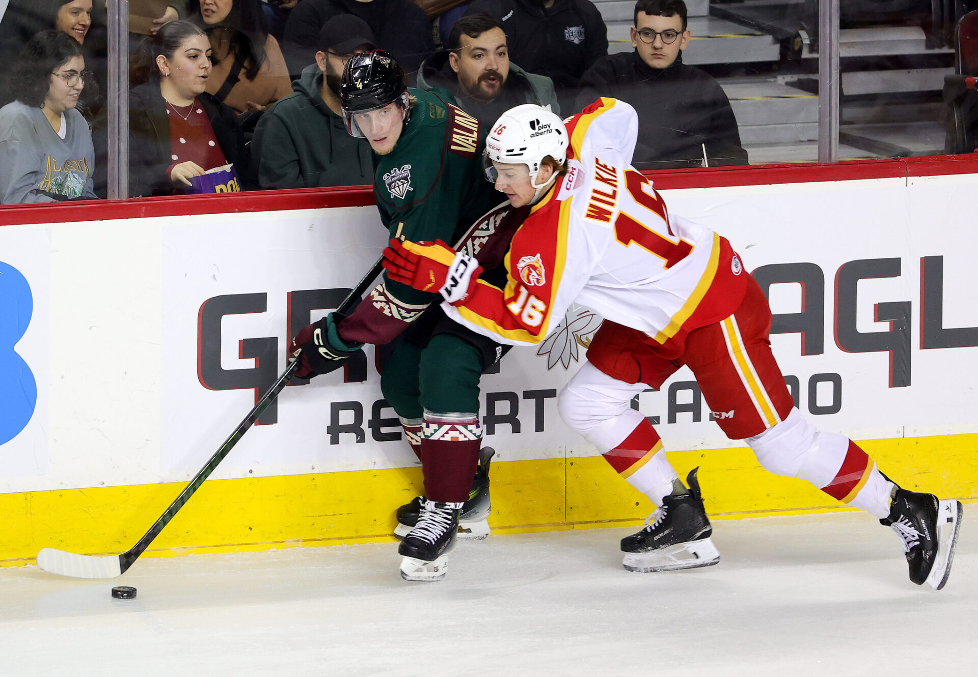 After the Wranglers pressed, the Canucks got a fortunate bounce at the side of the Calgary net to make the score 2-0 with 8:51 to go.